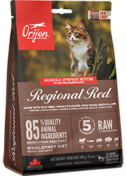 Wszystkie koty są mięsożercami, naturalnie przystosowanymi do diety bogatej w różne gatunki mięs, z dodatkiem owoców, warzyw i ziół.Jedzenie ORIJEN REGIONAL RED przepełnione jest białkiem zwierzęcym pochodzącym z wołowiny Angus, dzika, bizona, jagnięciny Romney i wieprzowiny Yorkshire. Mięso pochodzi z lokalnych farm i jest dostarczane codziennie świeże w odżywczych proporcjach WholePrey™.