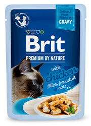 Brit Premium by Nature Cat Delicate Fillets in Gravy with ChickenBrit Premium Pouches with Fillets Chicken to karma klasy premium, idealnie nadająca się dla dorosłych kotów. Pyszna i zdrowa, jest idealna dla kocich smakoszy. Dostarcza kotu wszystkich potrzebnych mu witamin i minerałów.