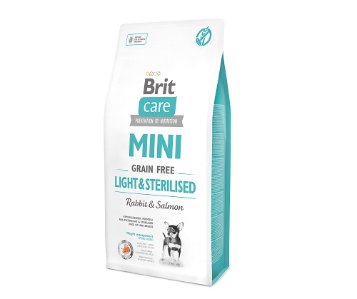 Pełnoporcjowa karma klasy super premium, o hipoalergicznej formule, nie zawierającej pszenicy, soi czy innych zbóż modyfikowanych genetycznie. Niskotłuszczowa dieta polecana psom mającym tendencję do tycia, z nadwagą i zwierzętom po zabiegu sterylizacji.Główne założenia formuły karmy Brit Care Grain Free Light & Sterilised
