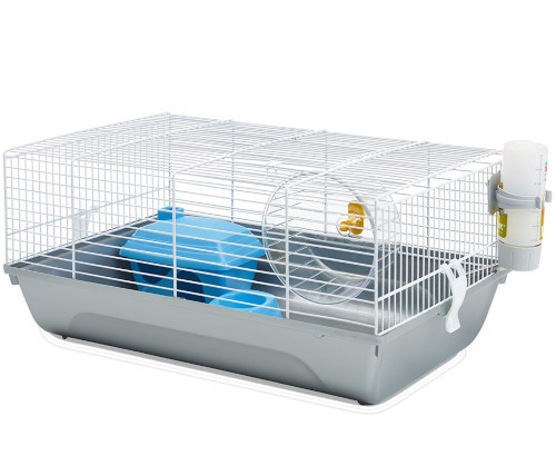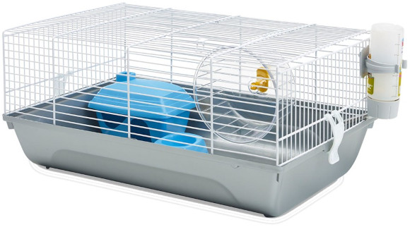 To wszechstronna klatka, z górą wykonana z niebieskich, metalowych pręcików i plastikową, różową kuwetą. To klatka z pełnym wyposażeniem, posiadająca koło, domek, miseczkę i poidełko.