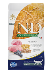 Farmina N&D Ancestral Grain to pełnoporcjowa karma dla dorosłych kotów wszystkich ras z wysokiej jakości mięsem z jagnięciny z ekologicznych hodowli i borówką amerykańską oraz z dodatkiem funkcjonalnych warzyw, owoców i wyciągów roślinnych.Jagnięcina jest mięsem cenionym za wysoką zawartość pełnowartościowego białka oraz właściwości hipoalergiczne. Charakteryzuje się również bogactwem żelaza, cynku, selenu oraz witamin z grupy B.