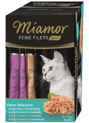 Opakowanie Miamor Feine Filets Mini Multibox Selection w galaretce zawiera aż osiem mini saszetek (50g), po dwie w czterech różnych smakach: kurczak z pomidorami, tuńczyk z krabem, tuńczyk z łososiem oraz tuńczyk z pomidorami.Ekskluzywnie lekkie kawałki filetów w delikatnej galarecie, uszlachetnione najlepszymi składnikami. Wysokiej jakości specjał z filetów, szczególnie lekkostrawny i lekkostrawny dla wymagających kotów. Bez wątroby i podrobów, bez produktów ubocznych pochodzenia zwierzęcego. Niska zawartość tłuszczu - również dla starszych kotów i osób z nadwagą.