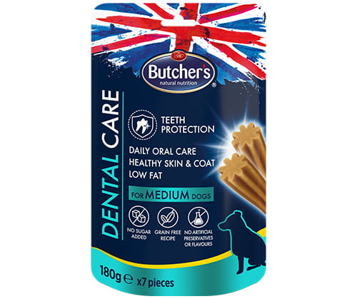 Najwyższej jakości składniki to klucz do zdrowia i dobrego samopoczucia Twojego pupila.Butcher's Dental Care to smaczne przekąski stworzone, by dbać o zdrowie i czystość zębów Twojego psa. Pomagają zapobiegać nagromadzaniu się kamienia nazębnego.