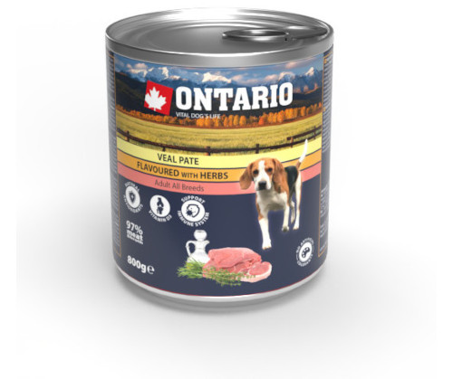 Karma Ontario Pate z cielęciną w ziołach to smakowity mięsny pasztet, który zawiera aż cztery jego rodzaje: cielęcinę (30%), wieprzowinę (23%), kurczaka (11%) oraz wołowinę (6%). Całość wzbogacona jest dodatkiem tymianku i rozmarynu ziół zawierających kwas fenolowy i flawonoidy, które znane są również ze swoich właściwości przeciwutleniających, przeciwbakteryjnych i przeciwzapalnych.Karma ta zawiera również witaminy i minerały, które pomagają utrzymać psa w dobrej kondycji. Z witaminą D3, która pomaga w utrzymaniu zdrowych kości i zębów oraz witaminą E, która wspomaga prawidłowe funkcjonowanie układu odpornościowego.