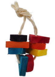 Zabawka w kształcie kolorowej grzechotki przeznaczona dla królików i innych małych ssaków wykonana jest w 100% z naturalnego materiału. Pomaga w ścieraniu przez zwierzęta zębów i pazurów. Produkt w swoim składzie zawiera jedynie drewno owocowe, sznurek sizalowy oraz barwnik spożywczy.