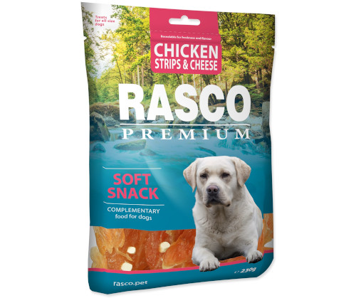 Przysmaki Rasco Premium Soft Snack Chicken Chips & Cheese w postaci kawałków suszonej piersi z kurczaka z serem przeznaczone są dla psów wszystkich ras.Wielkość opakowania: 230g