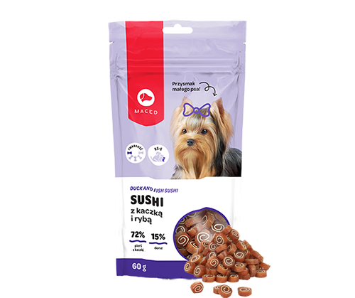 Przysmaki Maced to źródło białka niezbędnego do prawidłowego funkcjonowania organizmu psa. Smakołyki te są miękkie i elastyczne. Ich wielkość jest dopasowana do małych szczek, a jednocześnie ich rozgryzienie i przeżucie zajmie pieskowi sporo czasu. Smaczki Maced z kurczaka i ryby są przepyszne i jednocześnie bogate w wysokiej jakości białko zwierzęce. Sushi to malutkie, delikatne i miękkie przysmaki, polecane jako nagroda po treningu lub spacerze.