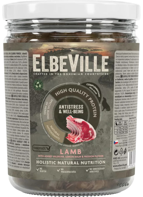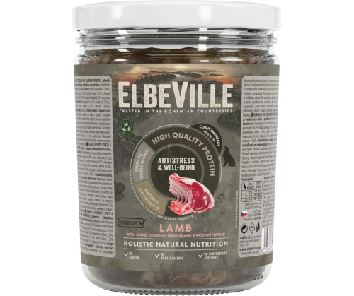 Mięso z jagnięciny 42,69%, bulion z wieprzowych skórek i nóżek 37,03%, bulion jagnięcy 18,2%, naturalny zagęszczacz 0,91%, kozłek lekarski 0,39%, melisa lekarska 0,39%, męczennica cielista 0,39%.Analiza składu karmy Elbeville