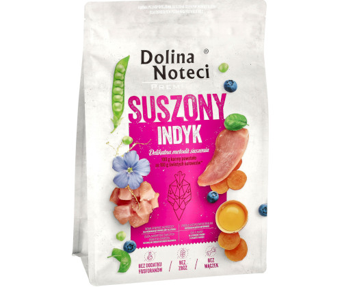 Karma Dolina Noteci Premium -indyk to pełnoporcjowa suszona karma dla psów wszystkich ras, pokrywająca w 100% ich dzienne zapotrzebowanie na wszystkie składniki odżywcze, w tym minerały i witaminy.