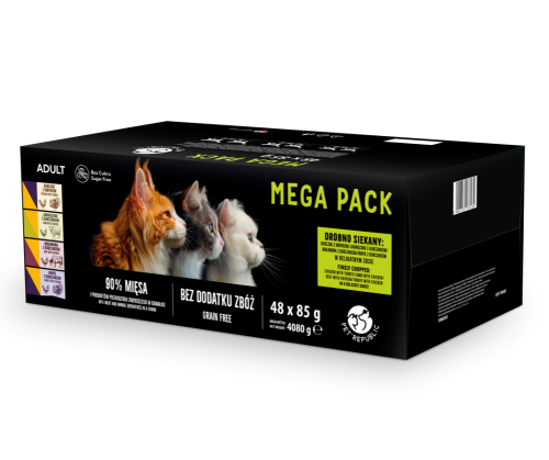 Pet Republic to doskonałej jakości, zbilansowany posiłek dla kocich łakomczuchów wszystkich ras. Karma przygotowana z najwyższą starannością w centrum Polski, z najlepszej jakości, świeżych surowców mięsnych. Zawiera aż 90% surowca mięsnego w kawałku. Bogata w składniki odżywcze oraz witaminy zapewni Twojemu kotu zdrowy, pełnoporcjowy posiłek na cały dzień!