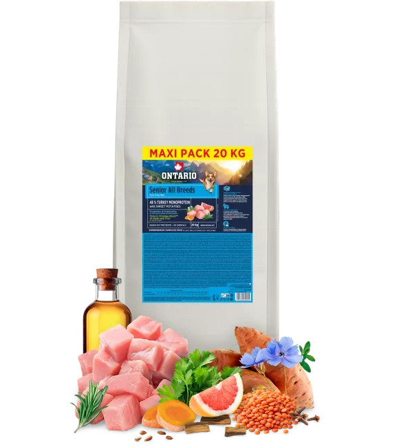 Świeży indyk 26%, suszone białko z indyka 23%, bataty 13%, czerwona soczewica 11%, skrobia ziemniaczana 8%, tłuszcz drobiowy (konserwowany naturalnymi tokoferolami) 5%, suszona pulpa buraczana 3%, naturalny aromat roślinny 2,5%, drożdże, suszony korzeń cykorii 2%, siemię lniane 1%, minerały, olej z łososia 0,5%, ekstrakt z juki schidigera 0,5%, fosforan jednowapniowy, chlorek choliny 0,2%, mieszanka suszonych ziół i ekstraktów roślinnych 0,15% (0,1% suszony tymianek, Rozmaryn i pietruszka, 0,05% Ontario VitalAge Blend™ (ekstrakty roślinne z grejpfruta, kurkumy, goździków i rozmarynu)), mannanooligosacharydy (Actvie MOS 0,1%), siarczan chondroityny (270 mg/kg), siarczan glukozaminy (200 mg/kg), Lacticaseibacillus paracasei HA - 108 inaktywowany (7,5 x 10^9 komórek/kg).