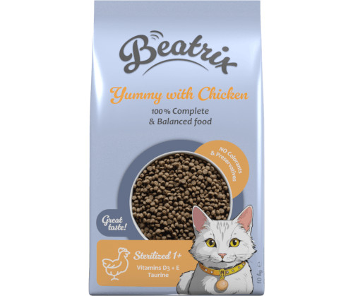 Karma pełnoporcjowa dla dorosłych kotów sterylizowanych od 1 roku życia.Charakterystyka suchej karmy Beatrix dla sterylizowanych kotów