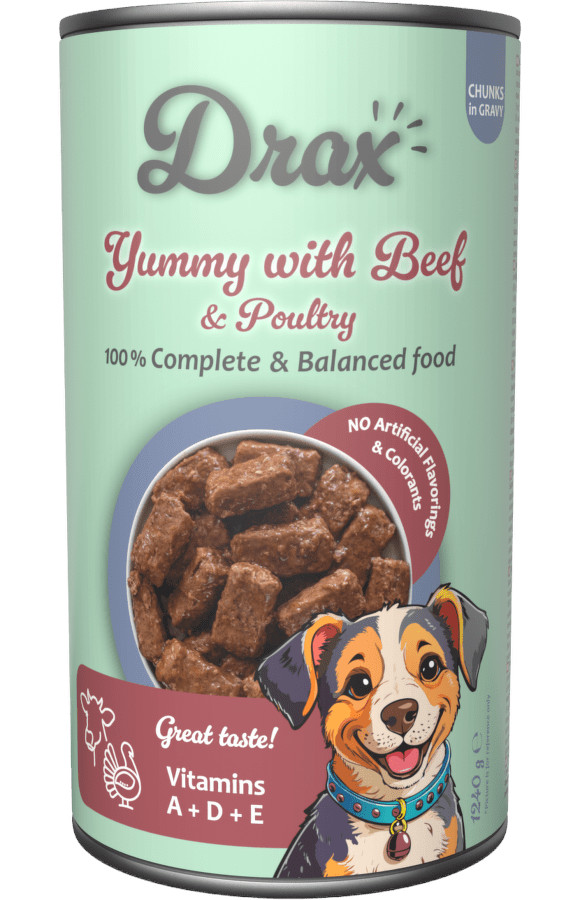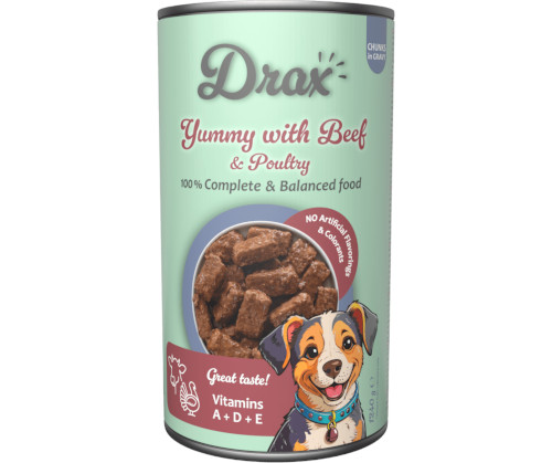 Kompletna karma dla dorosłego psa. Smaczne kawałki wołowiny i drobiu w delikatnym sosie idealnie nadają się do codziennego karmienia i łasucha.Zalety karmy Drax dla psów: