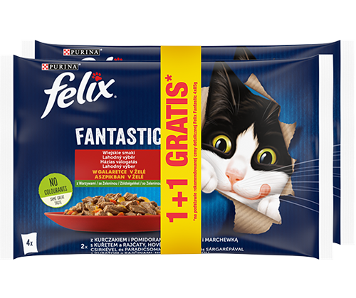 Dania Felix Fantastic wyglądają, pachną i smakują tak przepysznie, jak jedzenie, które mógłbyś przygotować sam. Każda receptura zawiera delikatne kąski z pysznymi warzywami w soczystej galaretce, którym Twój kot nie będzie mógł się oprzeć! "A to nie wszystko!